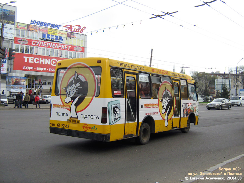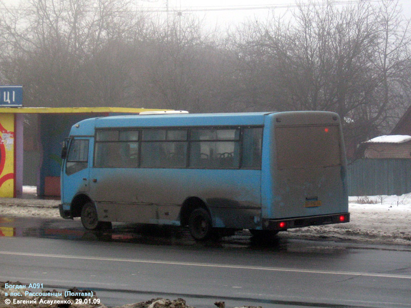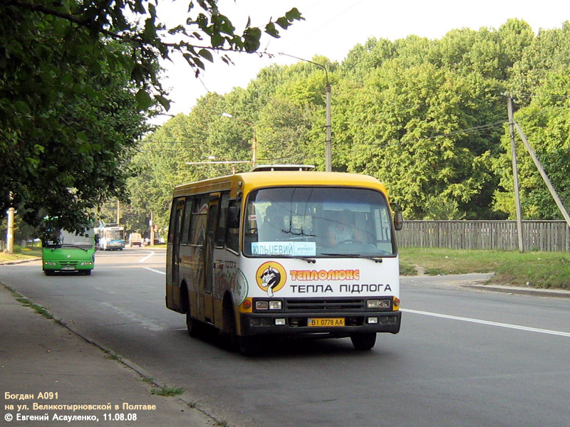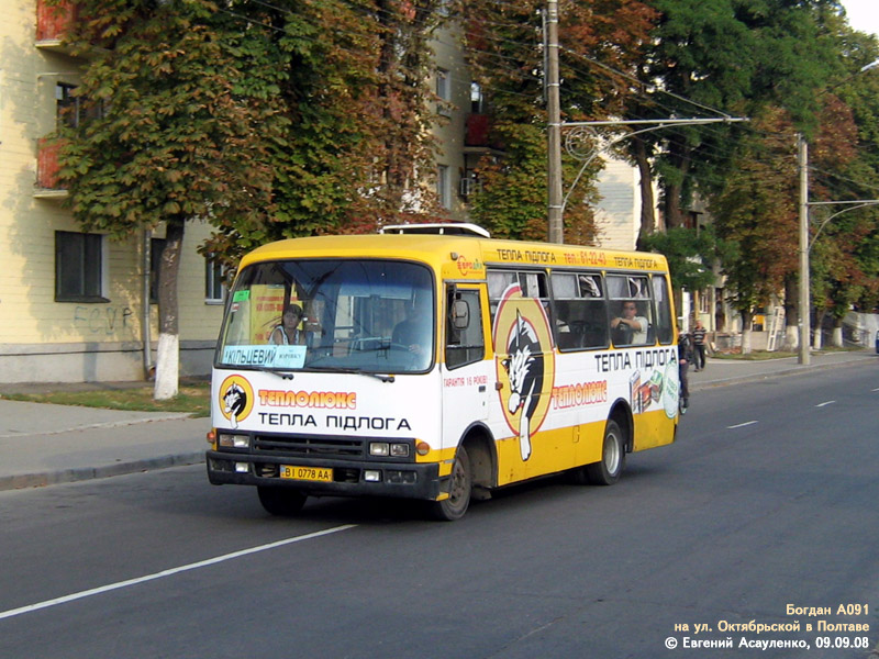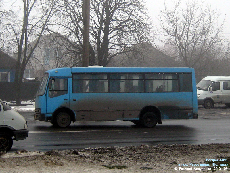 В эпоху массового выпуска автобусов малого класса заводом "Богдан" (2000-2003 года) Полтава ещё не интересовалась подобными автобусами - по улицам города ездили исключительно автобусы большого класса - ЛАЗ-695, ЛАЗ-52523, Икарус, шведские Volvo и Scania. Поэтому новыми А091 в Полтаву никогда не поставлялись. |