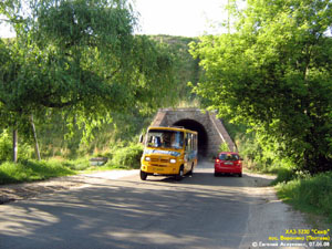Автобус выезжает из тоннеля, соединяющего ул. Тоннельную (пос. Воронина) и ул. Правды (Рогизна). Вверху по насыпи проходит одноколейная железная дорога. |