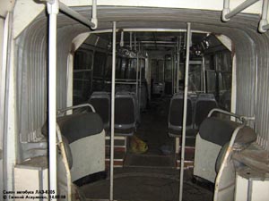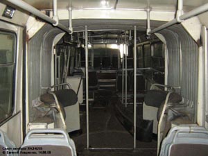 Салон автобуса. Вид на заднюю площадку. ЛАЗ-6205 мог одновременно увезти 190 пассажиров. |