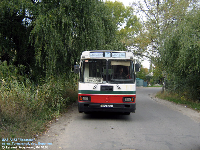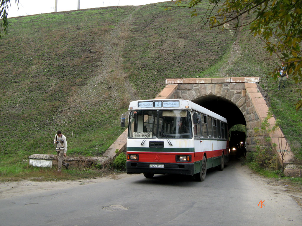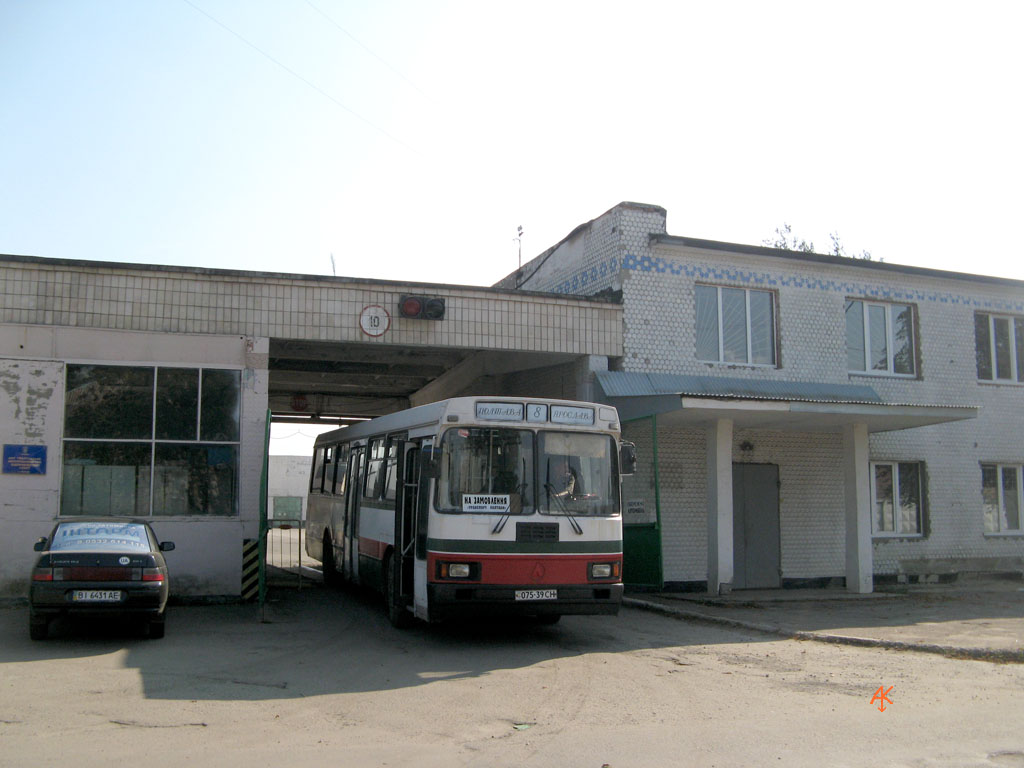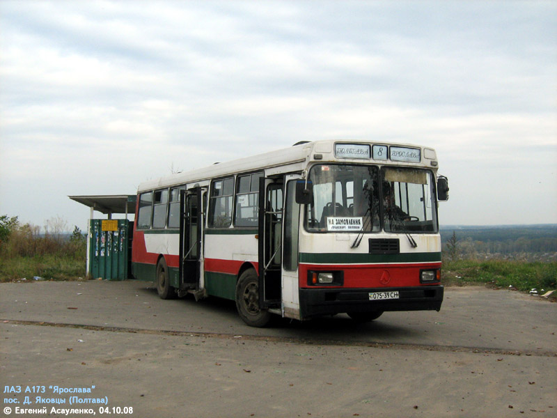Перед выездом. В маршрутоуказатель были заготовлены надписи "Полтава" и "Ярослава". А в маленьком окошке - цифра "8" - родной маршрут этого автобуса. Дополняет - табличка "На замовлення. «Транспорт Полтави»" ("Заказной. «Транспорт Полтавы»"). |