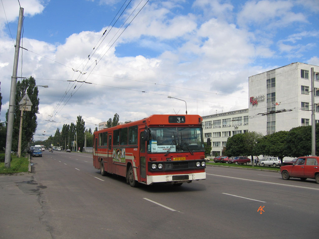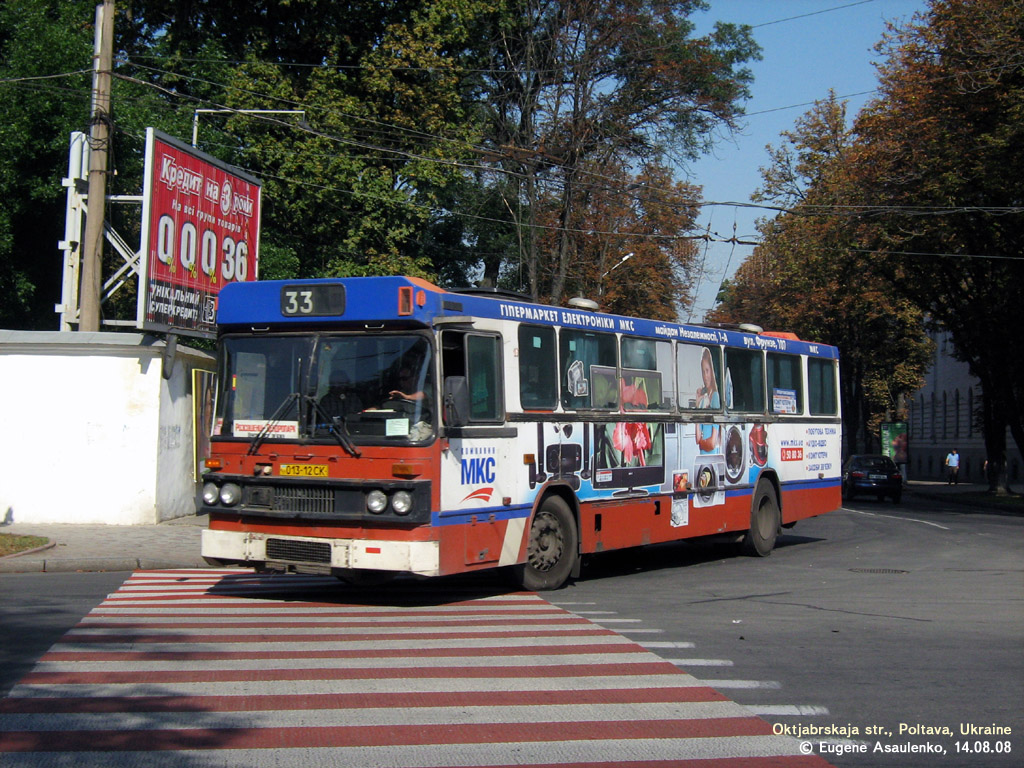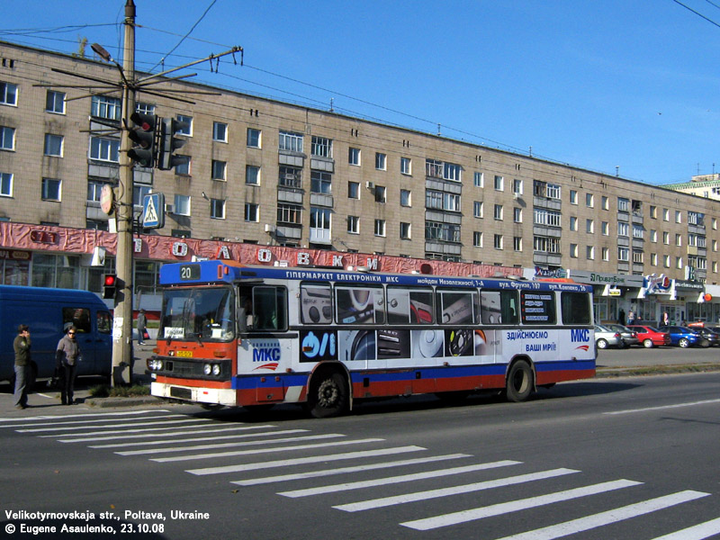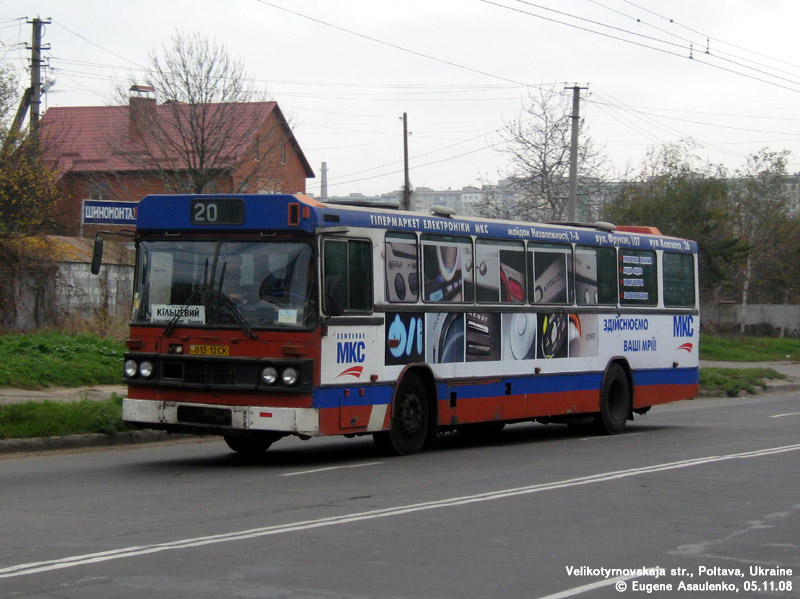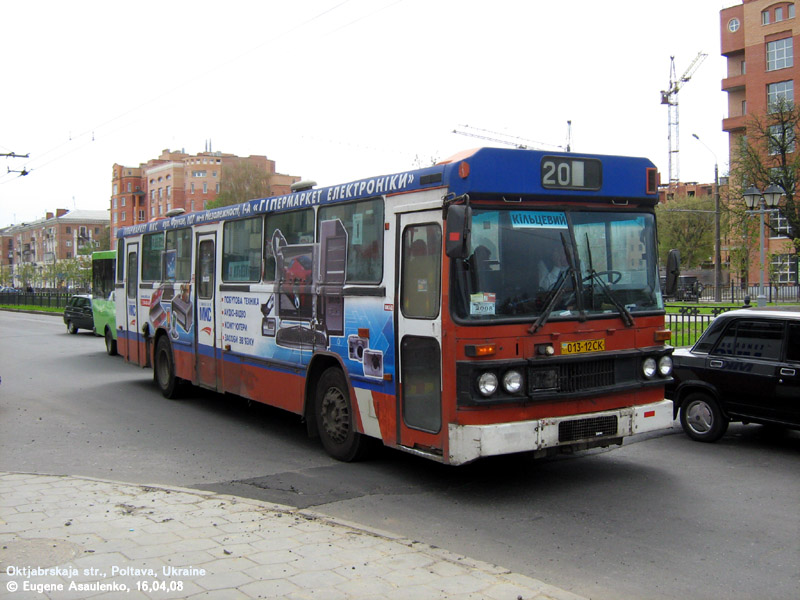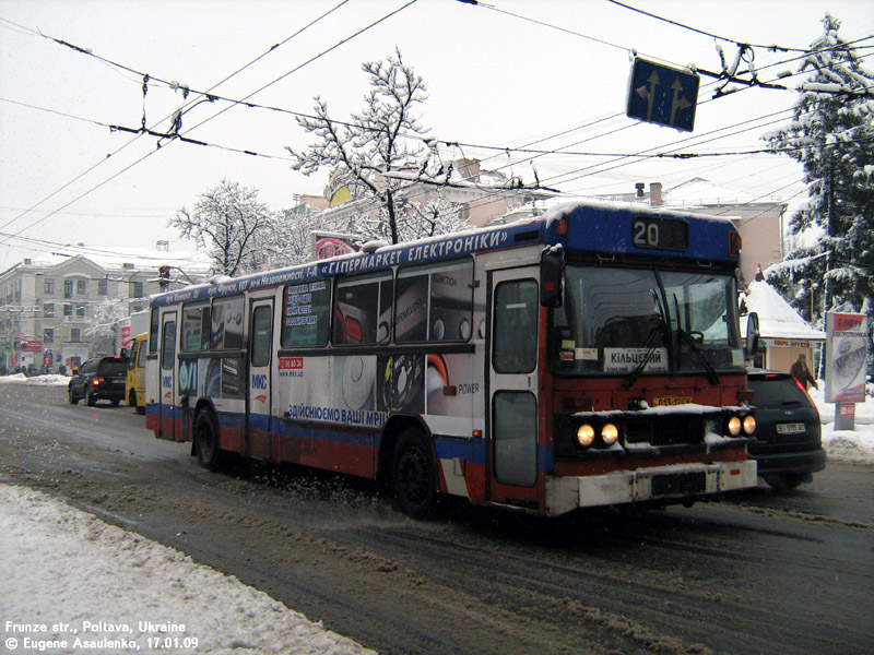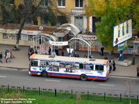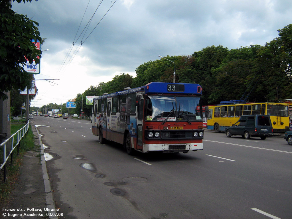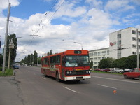 Ул. Фрунзе. Автобус следует по маршруту "пос. Рассошенцы - Дендропарк". Этот маршрут был открыт в 2003 году. До этого по ул. Яковчанской - от конечной "Институт связи" к Дендропарку небыло автобусного сообщения. В то время номерация автобусных маршрутов небыла обязательной, и в маршрутоуказателях нескольких автобусов, работающих на этом маршруте было выставлено "3а" - по аналогии с троллейбусным маршрутом с этим номером, который ездил по маршруту "Институт связи - пос. Рассошенцы", т.к. этот автобусный маршрут дублирован троллейбусный, но только с той разницей, что был на полтора километра длиннее от Интитута связи - к Дендропарку. С переименованием троллейбусного маршрута "3а" в "14" в скором времени и в данном автобусном маршруте надписи в МУ сменились на "14". Что было не совсем верным, т.к. в Полтаве ранее существовал маршрут с таким цифренным обозначением. Однако такими действиями в то время было немного легче "приучить" пассажиров к новому маршруту. Но в таком варианте такие обозначения просуществовали недолго - в 2006 году ввели обязательную номерацию автобусных маршрутов. Этому был присвоен №33. |