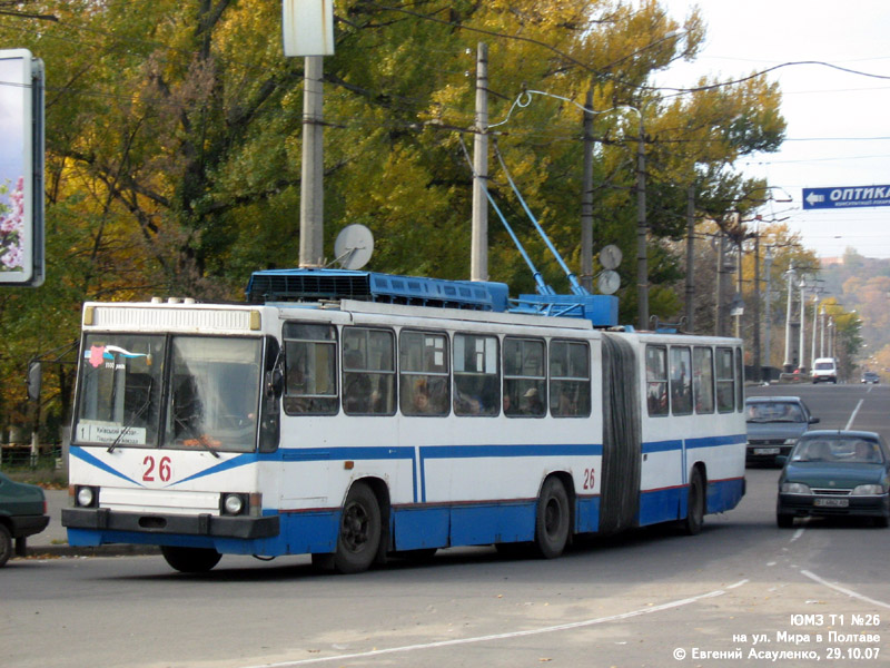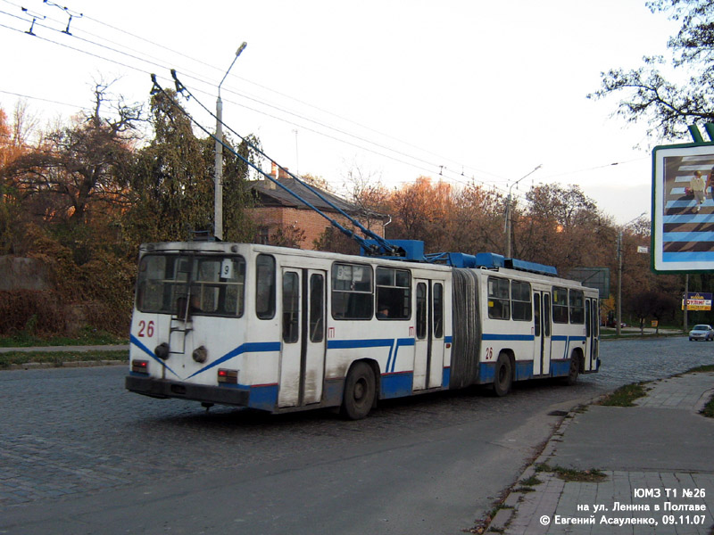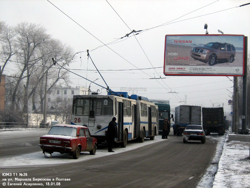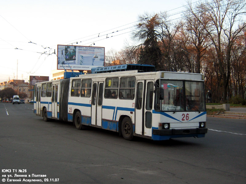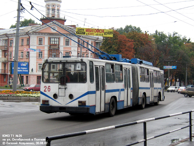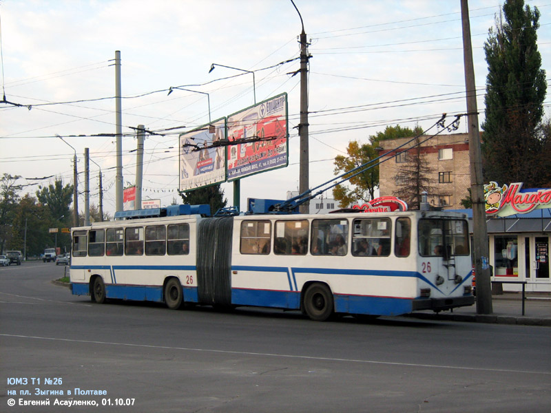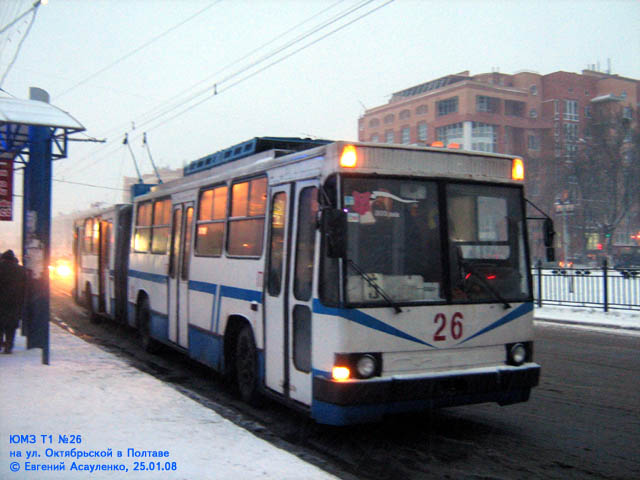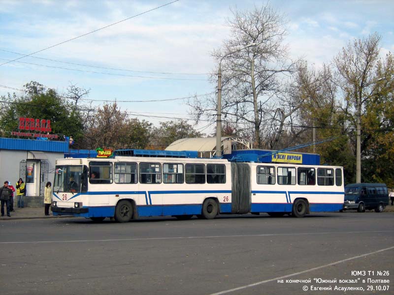 Подъзжая к Южному вокзалу. №26 принадлежит к первой группы троллейбусов ЮМЗ Т1 (с заводским номером до 111) которые отличались от последующих "высокими" стеклами (они начинались на большей высоте, нежели у последующих),