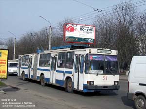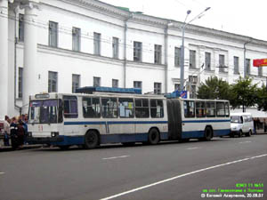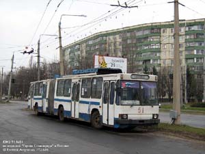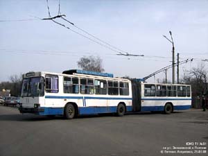 Во время дневного отстоя на конечной "Героев Сталинграда". Все троллейбусы-гармошки в Полтаве работают в разрыв - только в часы пик - утром и вечером. Все троллейбусы заежают в депо, но 1-2 стоят на вышеупомянутой конечной под присмотром диспетчера.