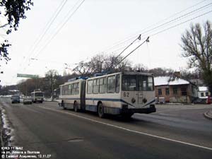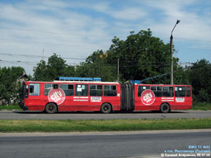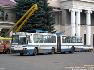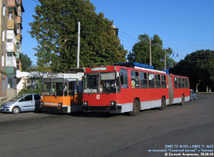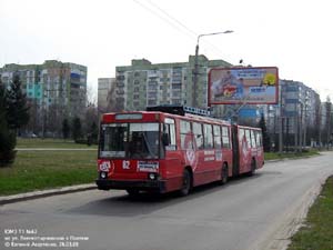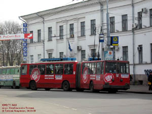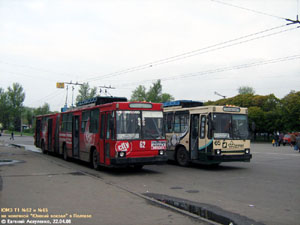 Новая послерекламная окраска. Вместе с троллейбусом №103, стоящим на вечернем перерыве на конечной "Киевский вокзал". А вот у тролейбусов-гармошек перерывов нет. |