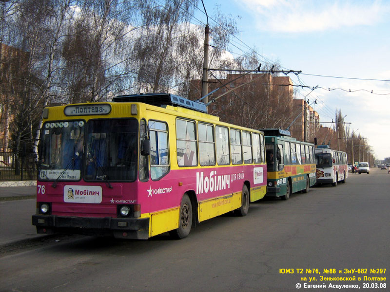На ул. Зеньковской - троллейбусы ЮМЗ Т2 №76, №88 и ЗиУ-682 №297. |