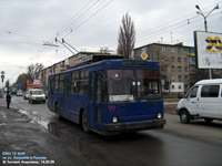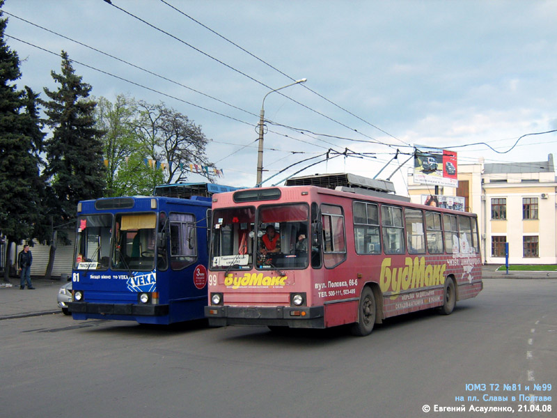 Вместе с ЮМЗ Т2 №81 на Южном вокзале. На развороте контактная сеть разделяется на две ветки, то позволяет троллейбусам объезжать друг друга. |