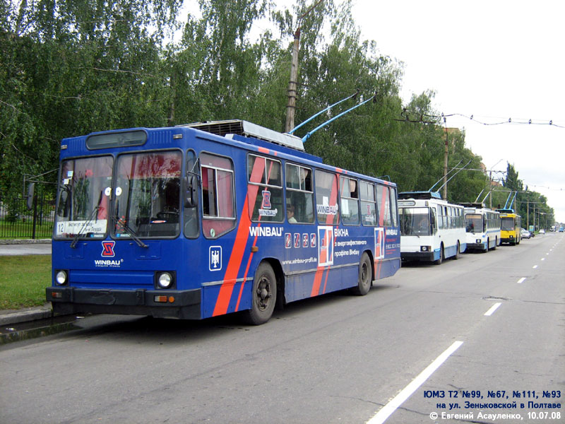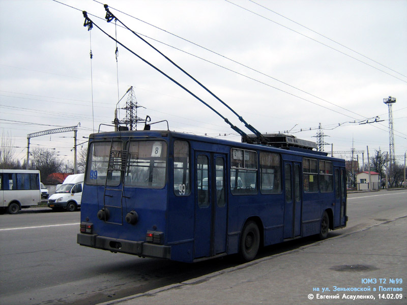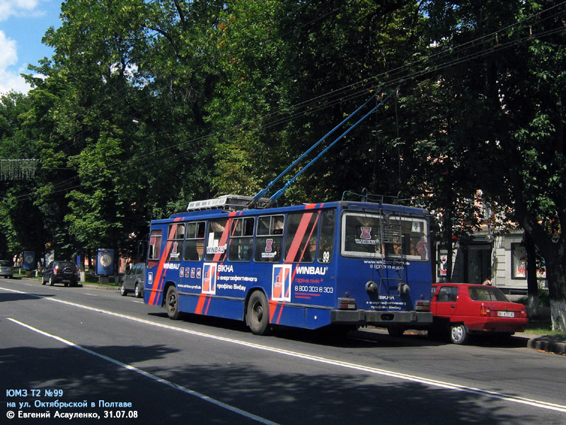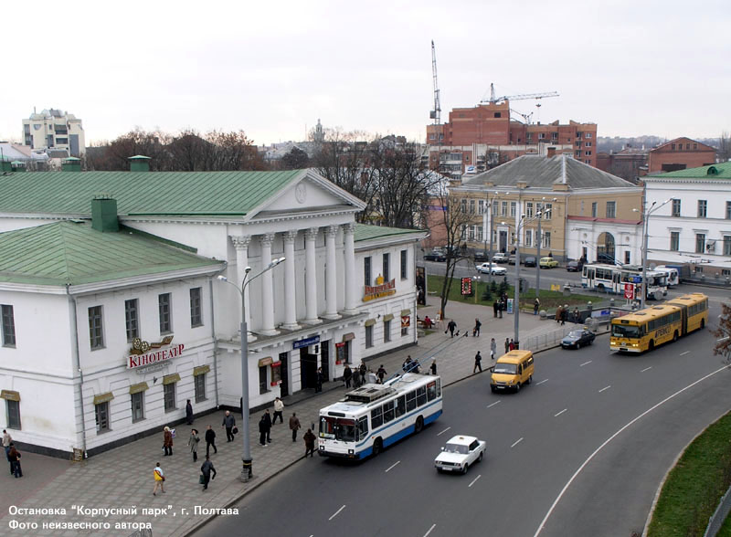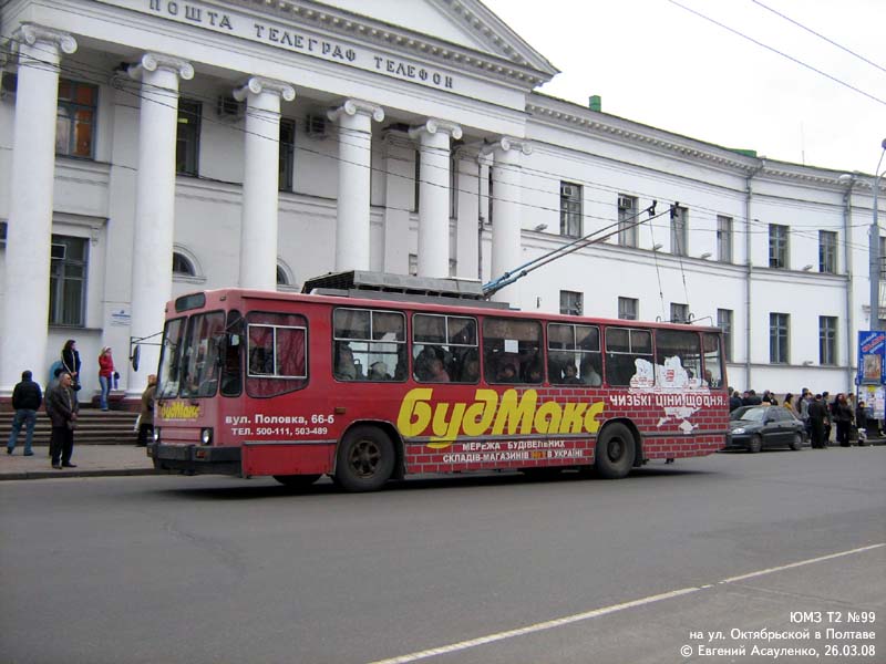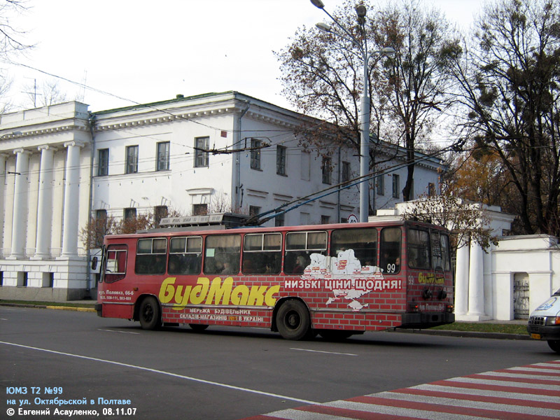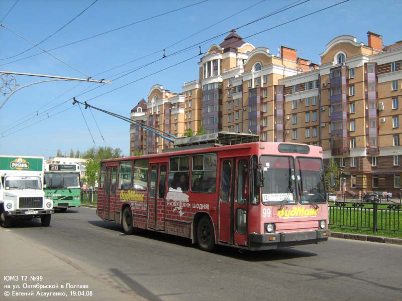 Троллейбусы ЮМЗ Т2 №99 и №89 на ул. Октябрьской. Автор фото к сожалению неизвестен. Фото найдено в локальной сети г. Полтавы. В случае установления авторства фото будет подписано его именем. |